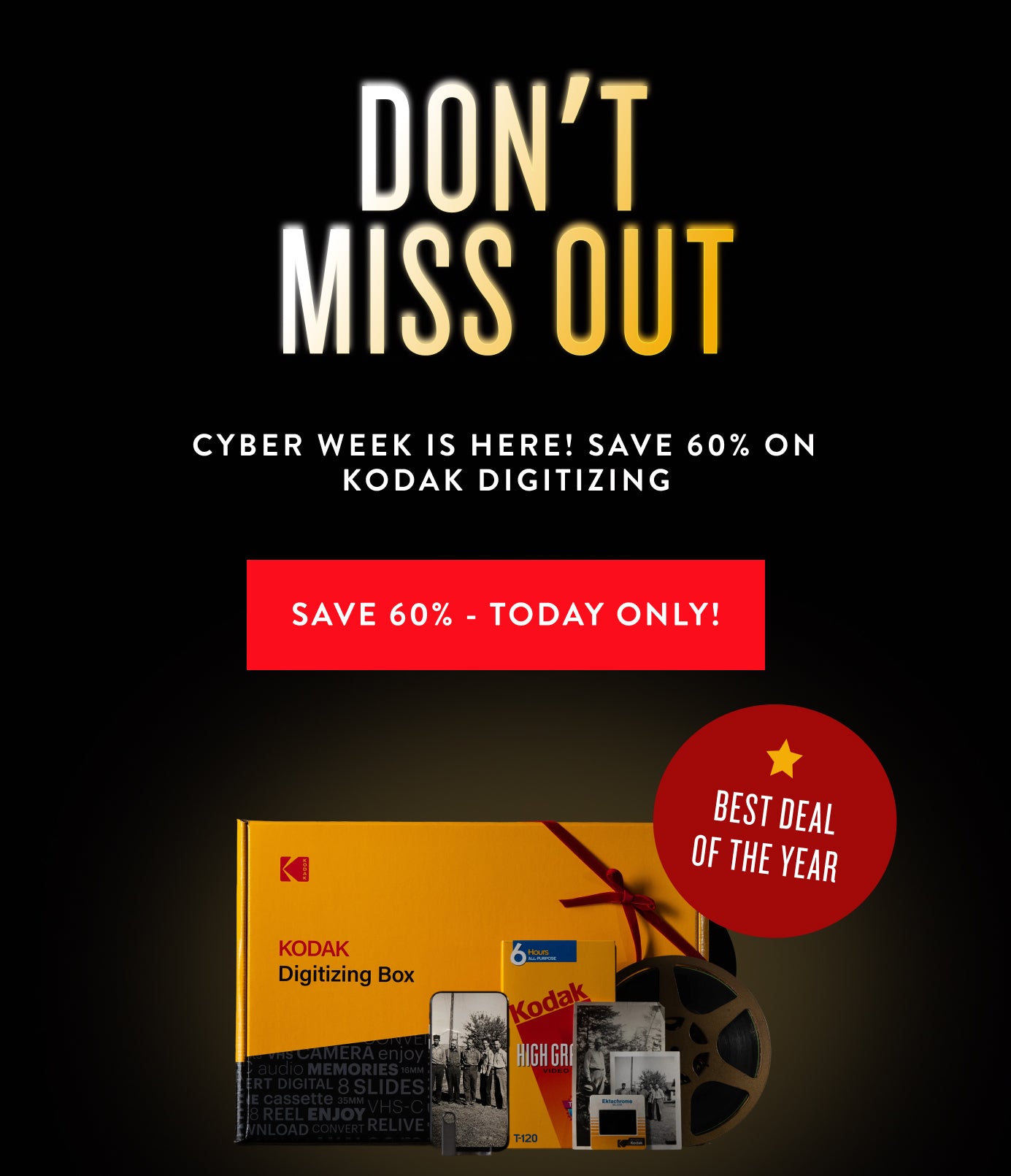 Since 1888 Kodak has continued to invent and revolutionize photography and motion pictures. That historic tradition continues with the KODAK Digitizing Box. Following in the footsteps of millions who trusted Kodak to develop their film by mail, KODAK Digitizing Box offers mail-in digitizing for all brands of videotapes, film reels, slides, and printed photographs.